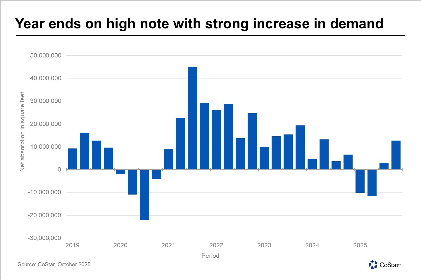 Nationally, improving demand and rent stabilization have allowed for positive absorption for the first time in several years, restoring some investor confidence. The office sector posted the largest increase in sales volume in 2025, nearly doubling industrial sales and outperforming multifamily and retail by roughly $4 billion each.